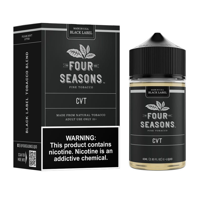Packaged in a 60ml Chubby Gorilla bottle with a child-resistant cap, Black Label CVT combines safety, convenience, and quality. Its 50 VG / 50 PG ratio ensures consistent flavor, smooth vapor production, and the ideal throat hit—perfect for all-day vaping. Proudly made in the USA, Four Seasons guarantees premium ingredients and reliable performance with every draw.