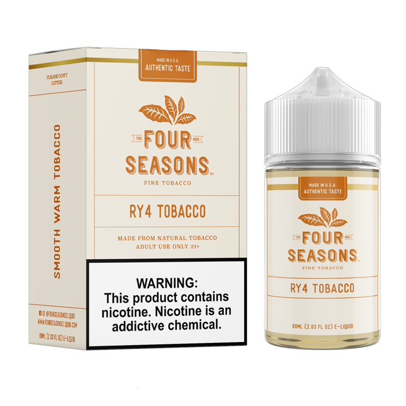 Experience the rich, smooth warmth of Four Seasons RY4 Tobacco, a carefully crafted e-liquid that blends classic tobacco notes with subtle sweet undertones for a balanced, satisfying vape. Made from natural tobacco, this flavor delivers a full-bodied experience that appeals to both traditional and modern vapers.